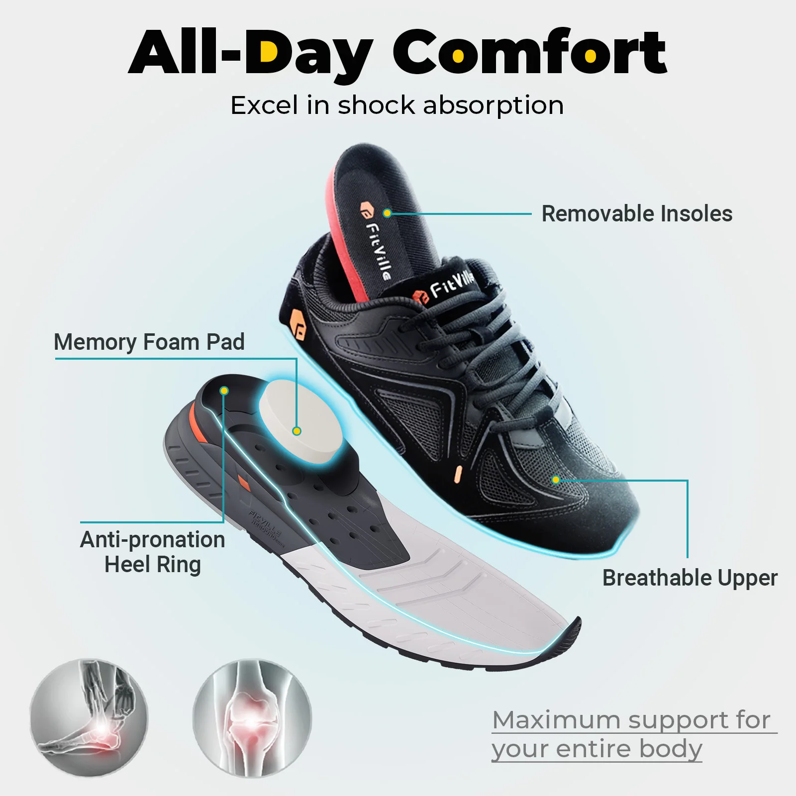 Wide-Toe-box & High-Instep Design: Including extended room for free movement of the toes, FitVille shoes is designed especially for people with wider feet and people suffering from foot problems like plantar fasciitis, flat feet, bunions and hammertoes.